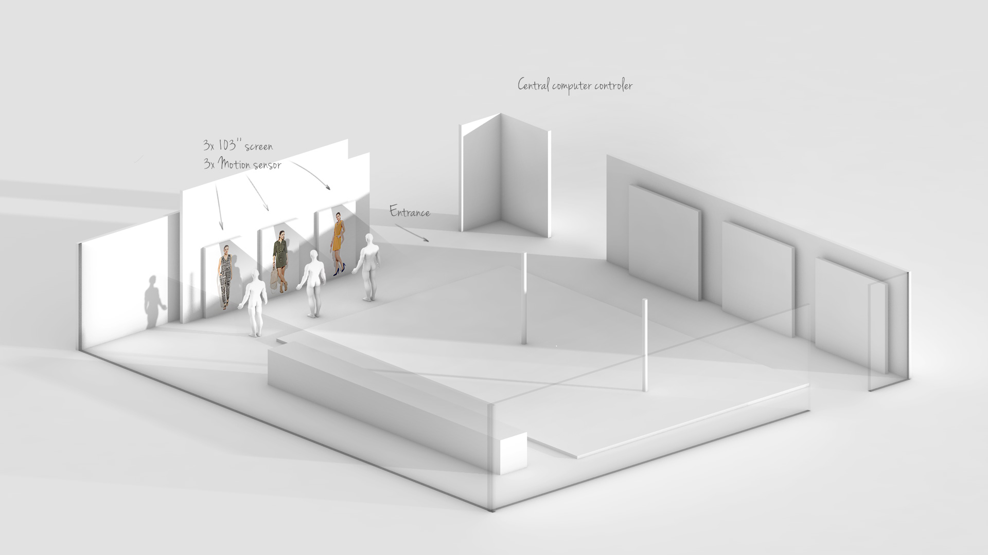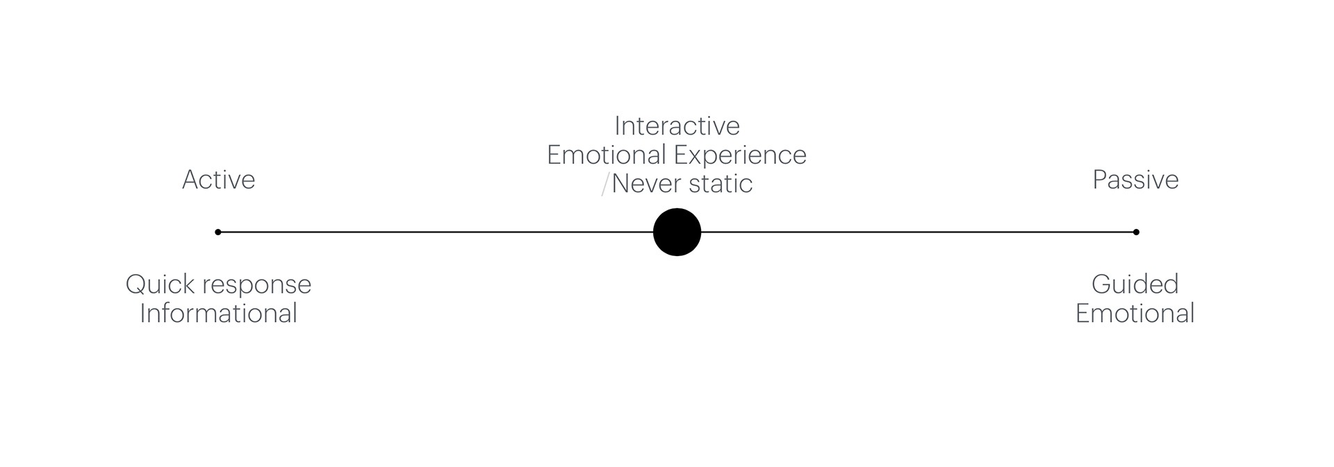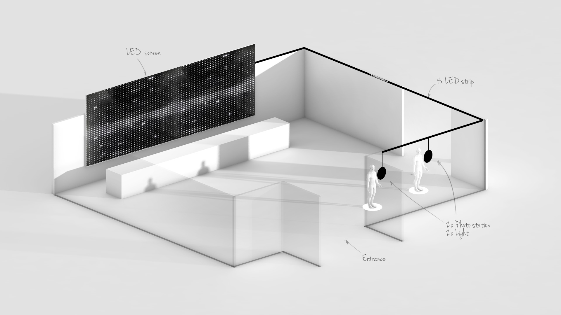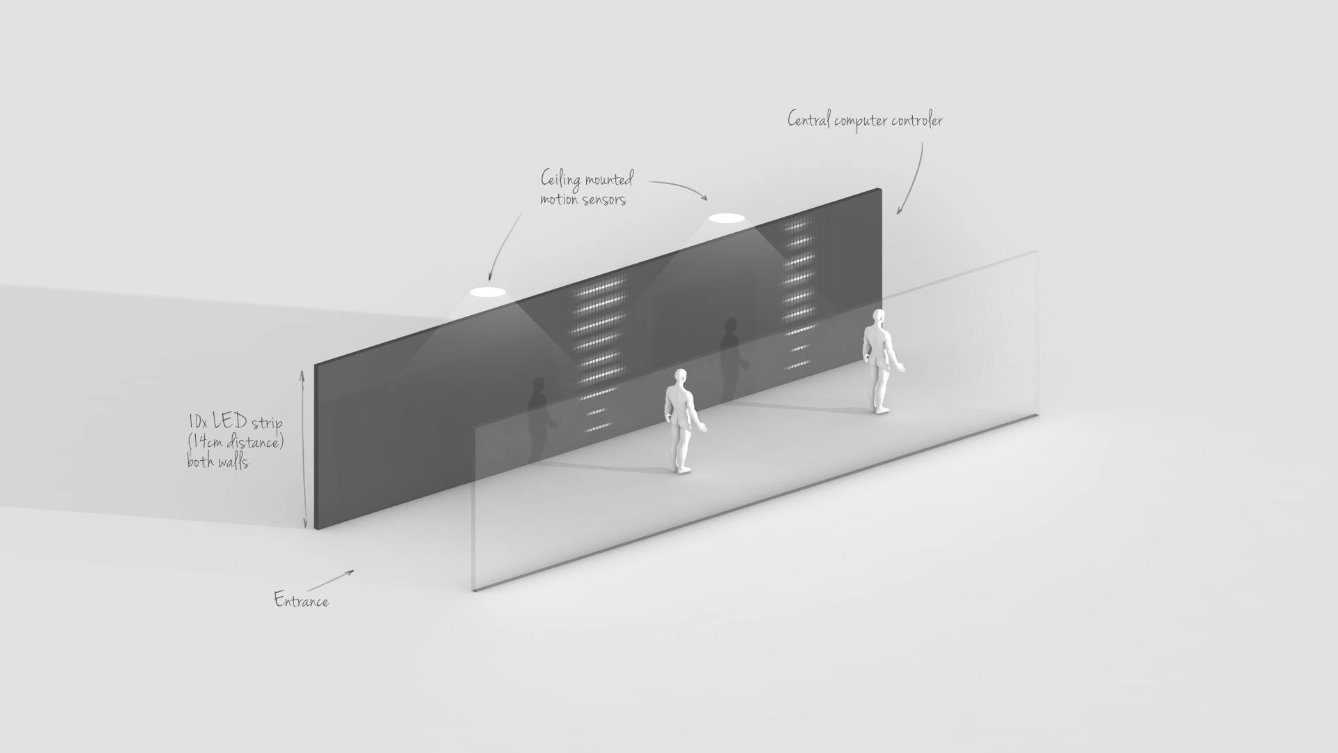 I was responsible for Concept, Art Direction and Design. We had four type of spaces to play with. For the entrance corridor we came up with rows of addressable LED strips placed on the walls along the walls. People walking along it